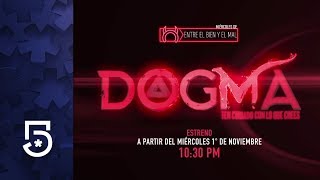 Dogma es una serie de televisión de suspense mexicana producida por Leonardo Zimbrón para Televisa. [1] La primera temporada se estrenó en la plataforma Blim y Canal 5 el 1 de noviembre de 2017. [2] [3] [4] La producción de la primera temporada concluyó el 10 de septiembre de 2016. [5] La serie cuenta la historia de Bruno (Daniel Martínez), un investigador de eventos sobrenaturales que se ve obligado a trabajar con Alicia (Iliana Fox), una teóloga especializada en cultos religiosos. Los casos que investigan incluyen rituales de exorcismo y otros fenómenos sobrenaturales.