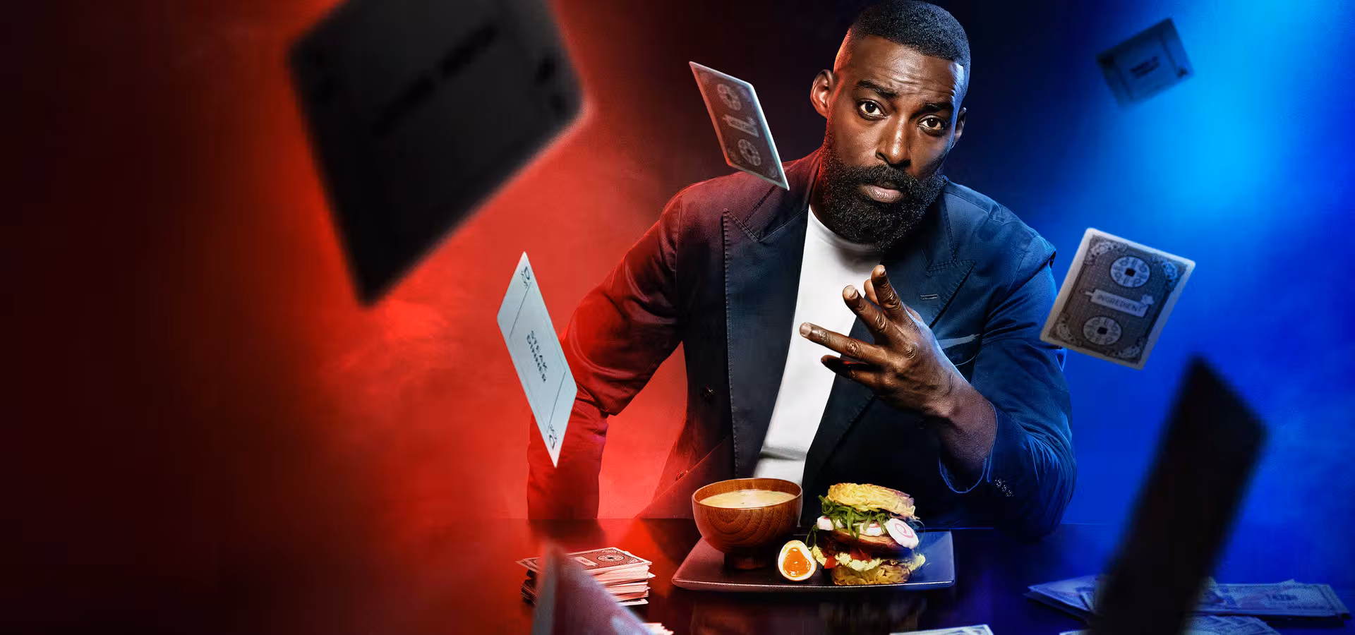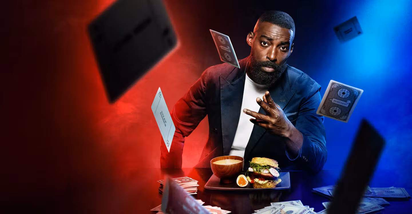 Después de la medianoche, Eric Adjepong invita a reconocidos chefs a jugar a su juego de cartas culinario, apostando $5,000 de su propio bolsillo.