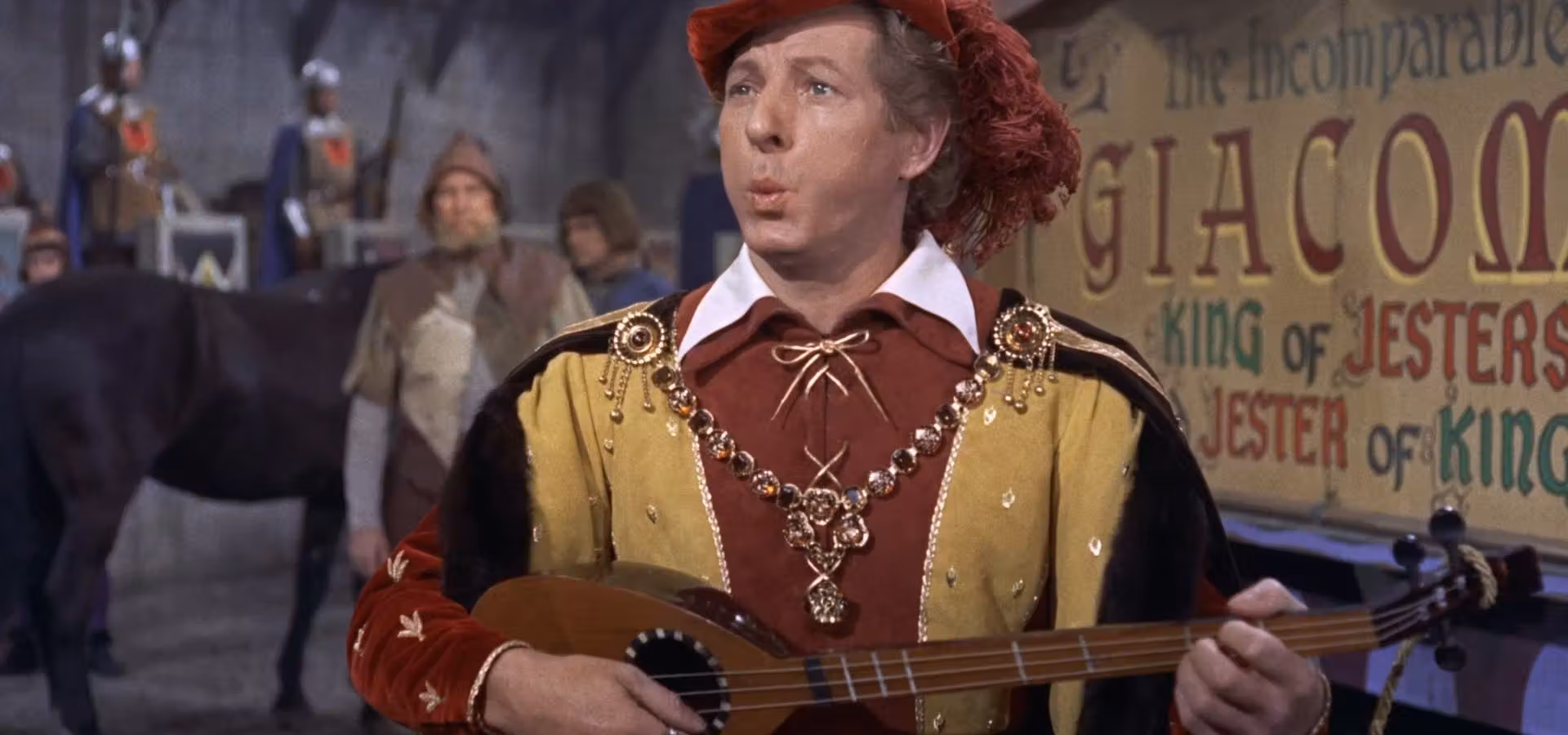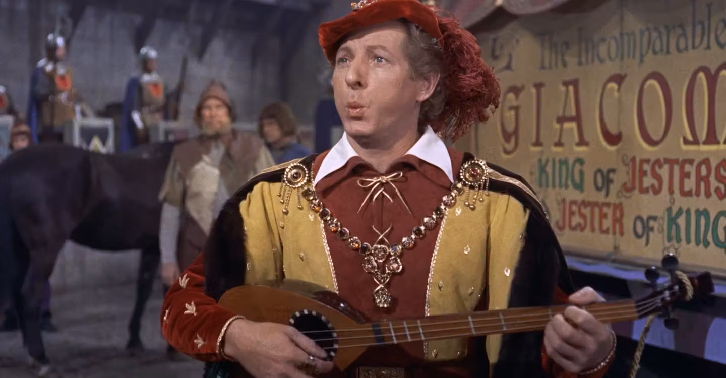Americký komik Danny Kaye (1911–1987) je u nás prakticky neznámý. Některé z jeho snímků jsme ovšem měli možnost vidět v televizi, např. Tajný život Waltera Mittyho (1947) nebo Bílé Vánoce (1954). K nejlepším z jeho děl patří kostýmní veselohra Dvorní šašek (1955), která mu byla ušita přímo na míru. Ztělesnil v ní bojácného člena zbojnické družiny, který v převleku za proslulého italského žertéře zachrání království před uchvatitelem i jeho intrikánskými dvořany, získá dívku svého srdce a pomůže dosadit na trůn právoplatného královského následníka. I v dalších úlohách uvidíme přední herce, Angelu Lansburyovou jako princeznu Gwendolinu, Mildred Natwickovou jako její chůvu, jejíž čarodějnické schopnosti zasáhnou významným způsobem do probíhajícího děje, a předního představitele nejrůznějších padouchů a nejlepšího hollywoodského šermíře své doby Basila Rathbonea, jenž vytvořil postavu zlotřilého sira Ravenhursta.