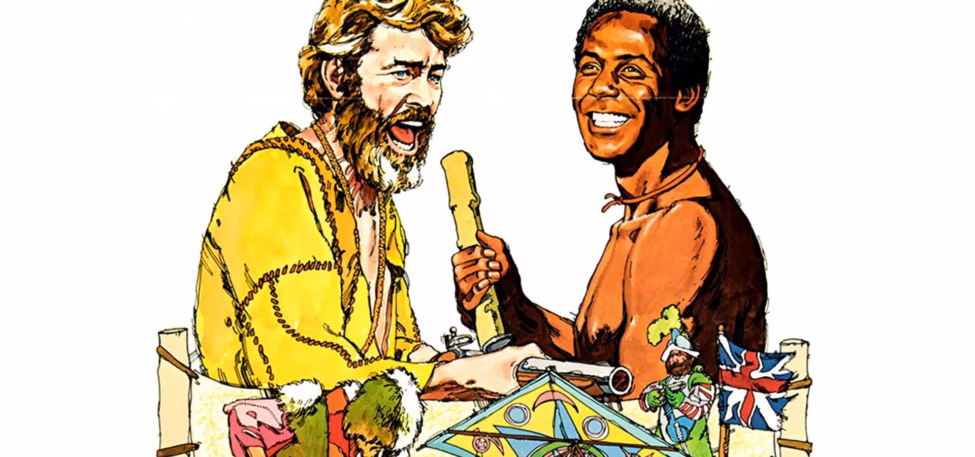 Seit Jahren sitzt der Europäer Robinson Crusoe nach seinem Schiffsbruch auf einer einsamen exotischen Insel fest als es eines Tages fünf Eingeborene bei einem Unwetter vom Kurs abkommen und ebenfalls an die Insel geschwemmt werden. Einer der Männer ist ertrunken bei diesem Unfall, die vier Verbliebenen machen sich an ein traditionelles Ritual und verspeisen ihren toten Freund. Robinson Crusoe platzt dazwischen und erschießt die Eingeborenen ohne Zögern, einen aber hält er für einen Gefangenen und verschont ihn. Er nennt den Mann Freitag und drängt ihn in die Rolle eines Dieners, dabei drängt er ihm sowohl die englische Sprache als auch das Christentum auf. Bei aller Eifrigkeit bemerkt Robinson nicht, das Freitag ihn ebenso belehren will wie anders herum