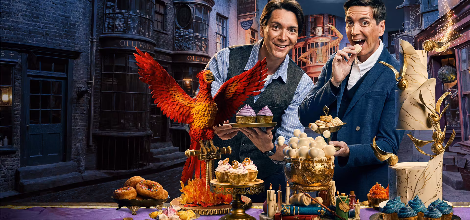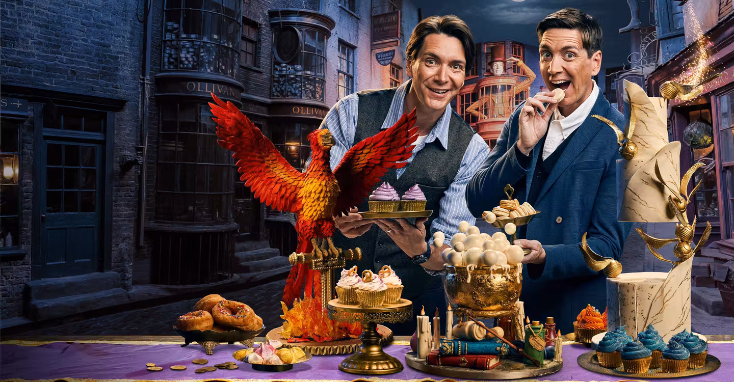 James and Oliver Phelps host as pairs of professional bakers create spellbinding edible showpieces on the actual Harry Potter film sets. Guest actors from the films share behind-the-scenes experiences as they join judges Carla Hall and Jozef Youssef.