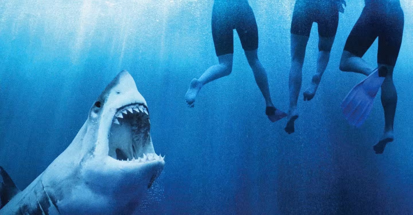 A great white shark hunts the crew of a capsized sailboat along the Great Barrier Reef.