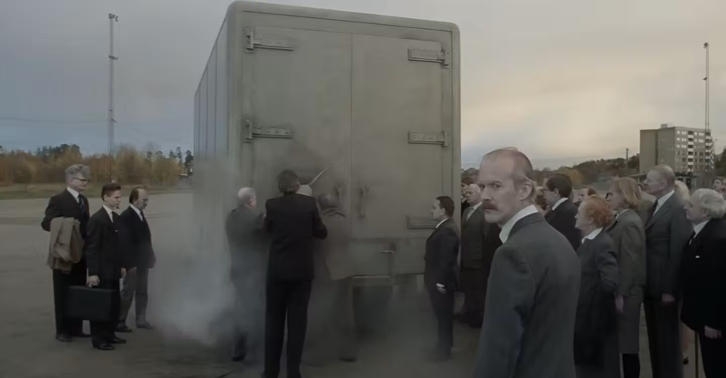 The narrative portrays a plain man who guides the viewer through his life in a bleakly stylised world.