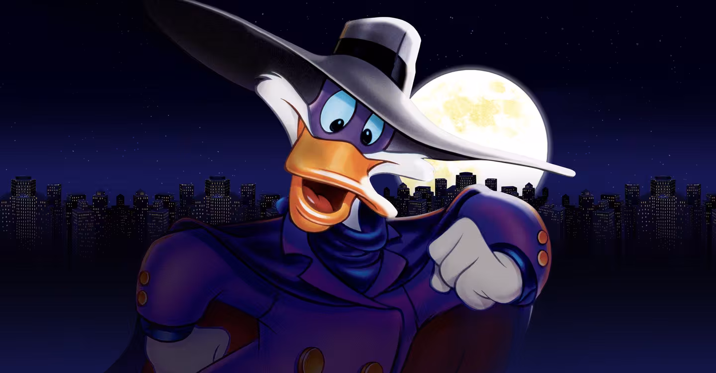 Darkwing Duck tells the adventures of the superhero, aided by his sidekick Launchpad McQuack. In his secret identity of Drake Mallard, he lives in a suburban house with his adopted daughter Gosalyn, next door to the bafflingly dim-witted Muddlefoot family.