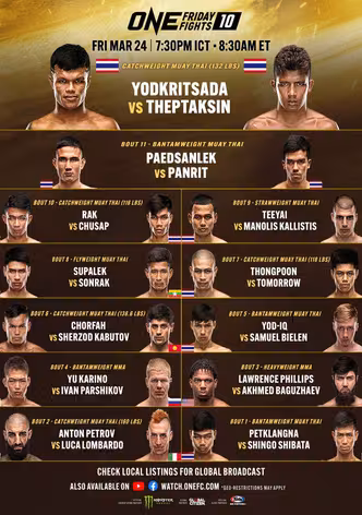 Watch Now StreamONE Friday Fights 10: Yodkrisada vs. Thepthaksin is not available for streaming.Let us notify you when you can watch it.Notify me